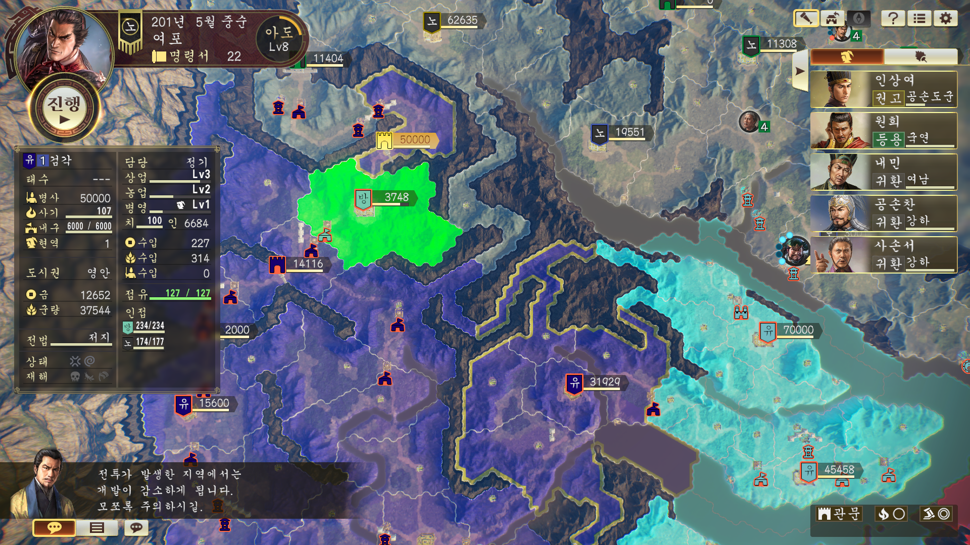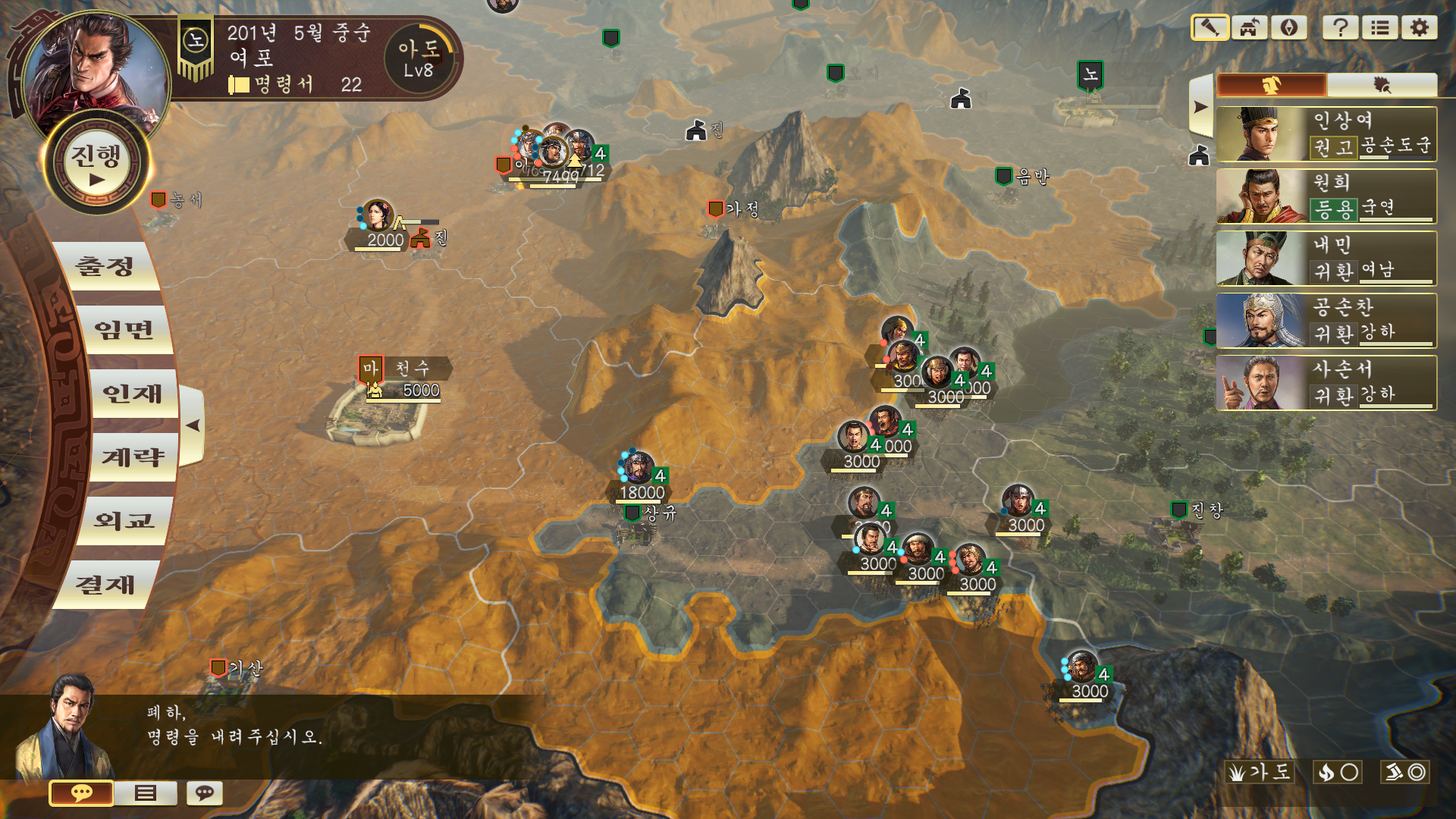 아니 수춘에서 건업까지 물자 수송하는데 9턴이 소요되질 않나 그 와중에 수송하던 장수가 사망해버리면 내 병사 2만명 군량 4만석이 없어져버려요 (경험)(정보)