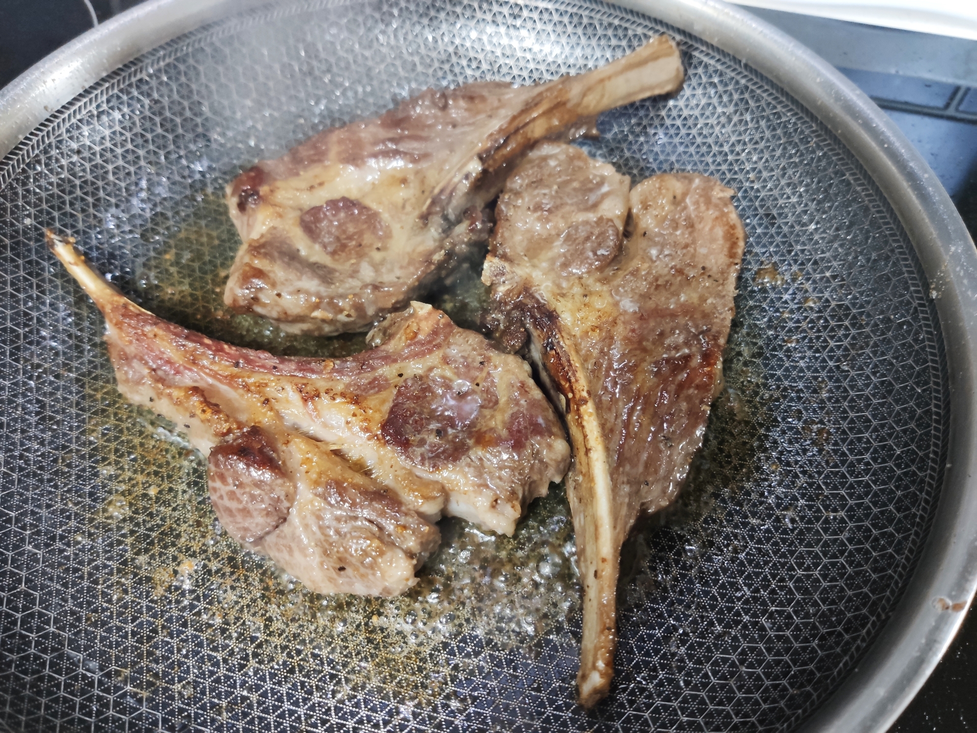 에어프라이어에서 나온 고깃덩이를 키친타올로 잘 닦아서 겉으로 나온 수분을 없애주는 게 포인트라고 하네요 안 그러면 팬에서 양갈비구이 대신 양갈비찜이 된다고 🤣