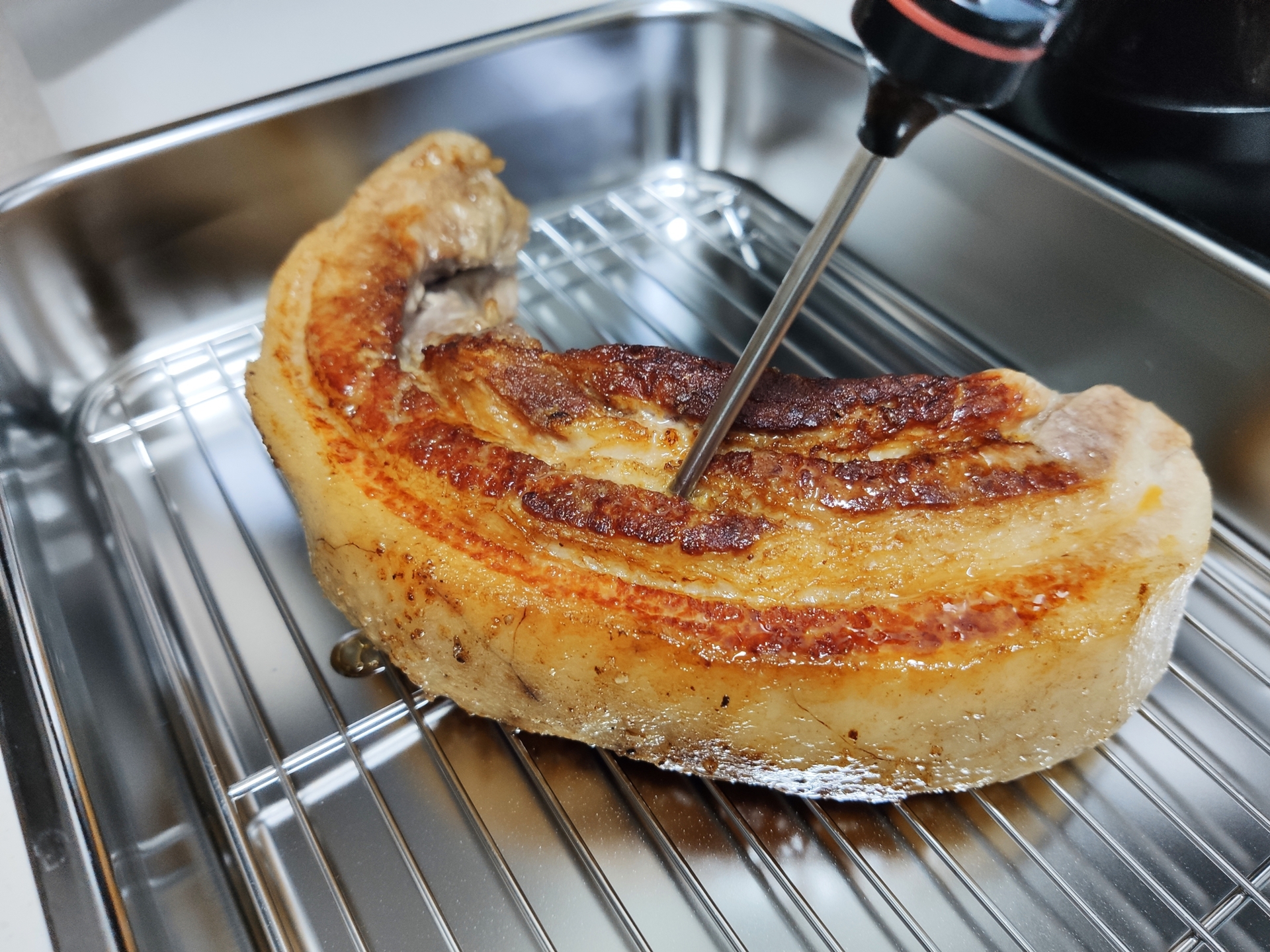 레스팅할 판이 없었기 때문에 도마 위에 긴 젓가락을 두 개 놓고 그 사이에 얹어놓았는데 온도계 찌른 구멍에서 육즙이 샌다 ㅋㅋㅋㅋㅋㅋㅋ 엌