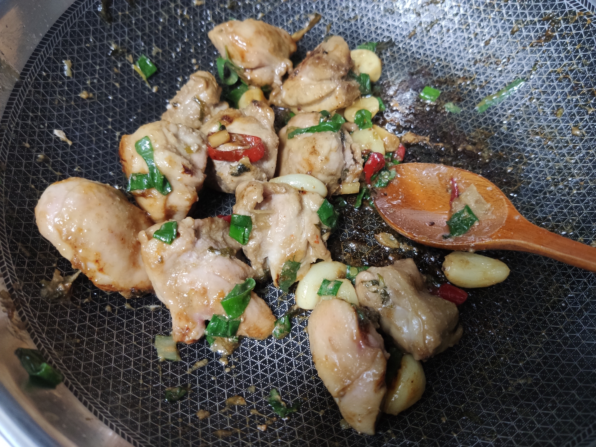 스댕팬에 기름 살짝 두르고 닭이랑 소스를 다 던져넣었는데 약간 기름 뭉친 게 나오는 것 같아서 첫인상이 썩 좋지는 않았습니다만 몇 초 지나니까 코를 찌르는 동남아 길거리 냄새랑 레몬그라스 냄새.