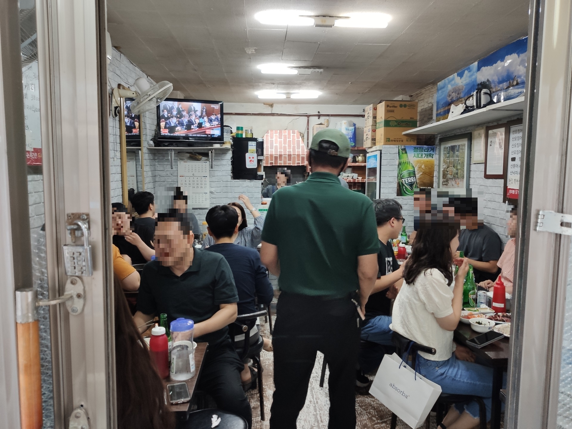 6시가 되기 전이지만 30명 정도 들어갈 수 있는 가게 자리 중 저기 메뉴판 앞 10자리만 비어있고 나머지가 이미 다 차 있는 모습이었는데요 다행히 좀 일찍 도착했기 때문에 메뉴판 아래의 손님에게 뭘찍어! 뭘찍냐고! 하며 한소리를 듣는 사태는 벌어지지 않았습니다.