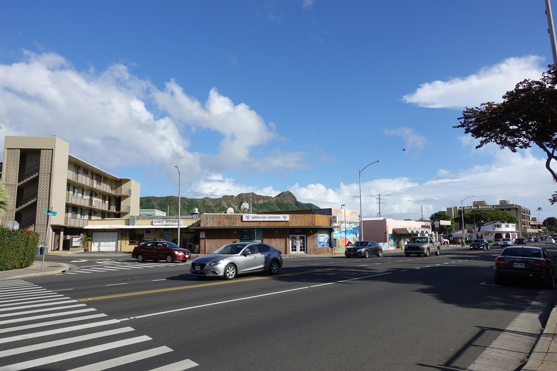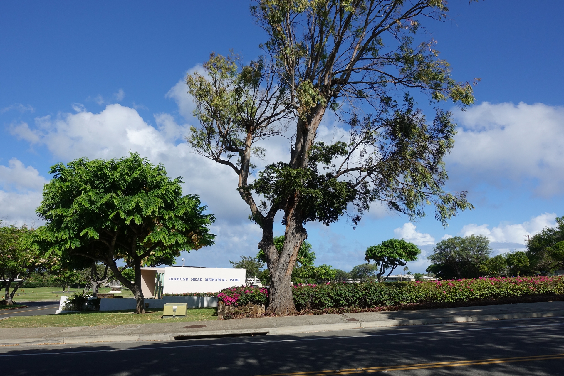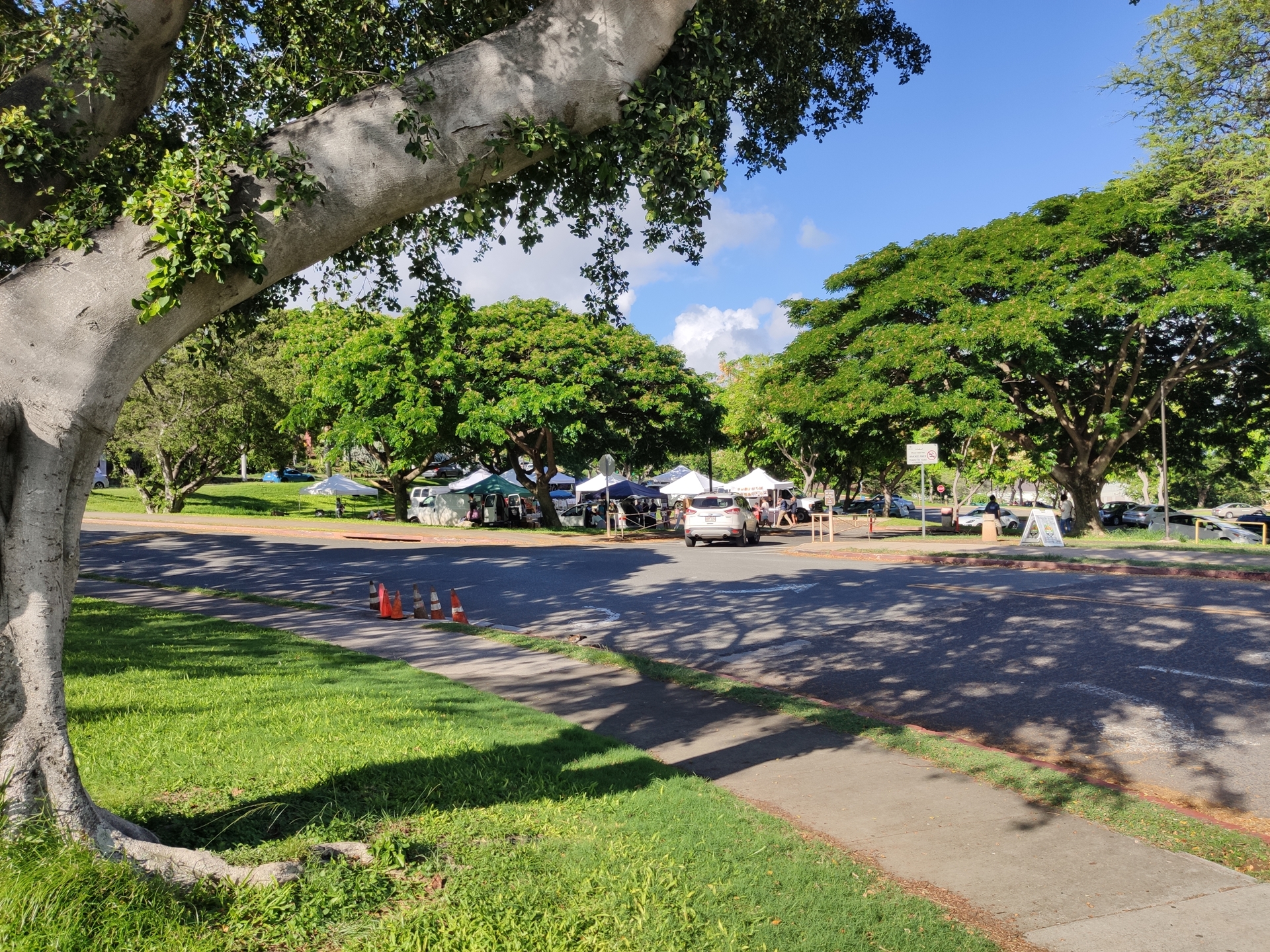 저 앞에 보이는 게 오아후 섬 전체를 한 눈에 조망할 수 있는 다이아몬드 헤드 산의 입구입니다만 여기에는 나중에 다시 올라올 거니 오늘은 일단 패스하도록 하고요, 맞은편에 있다는 파머스 마켓에 가 보도록 하겠습니다 두근두근