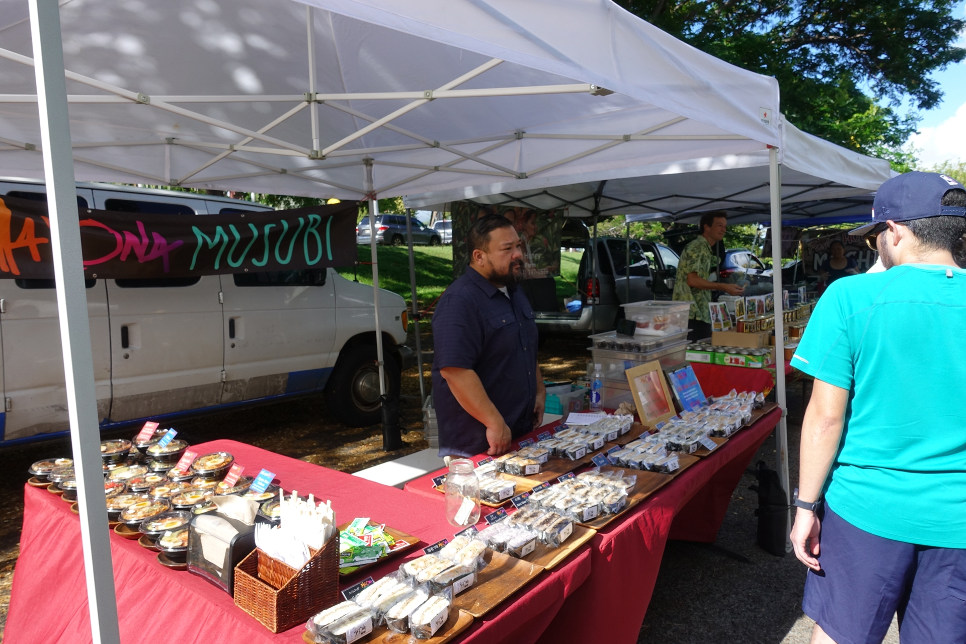 여러 가지 종류의 무스비를 쌓아놓고 파는 아재