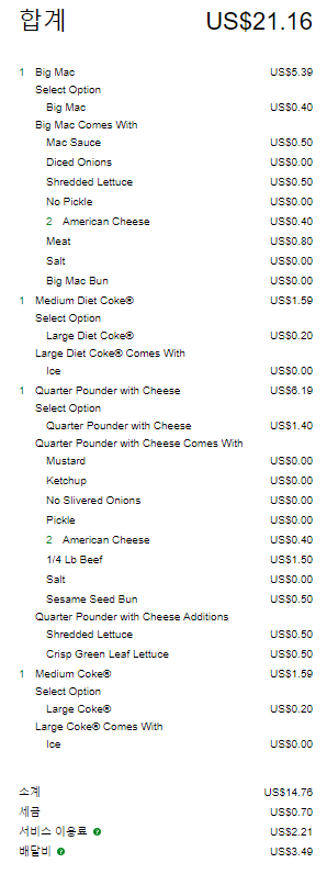 빅맥 $5.39 + 쿼터파운더 $6.19 + 제로콜라 $1.59 + 그냥콜라 $1.59 = $14.76