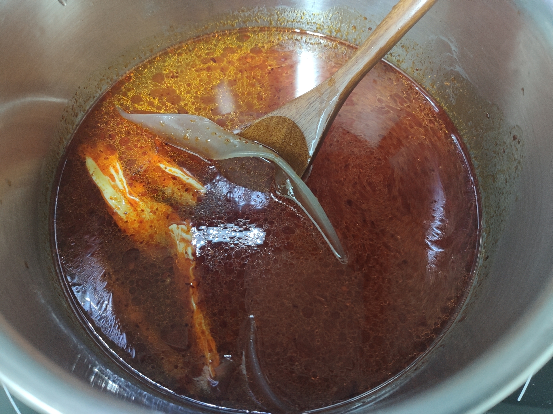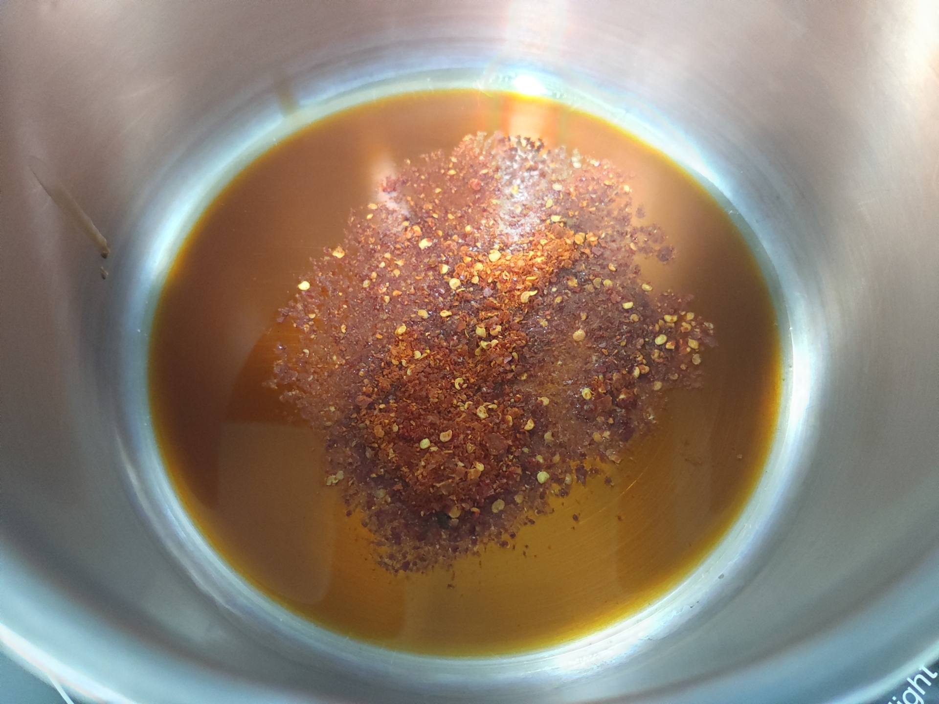 손질하는 동안 고추기름과 고춧가루가 든 냄비에 육수를 넣고, 끓어오르면 중국당면과 푸주를 넣어줍니다.