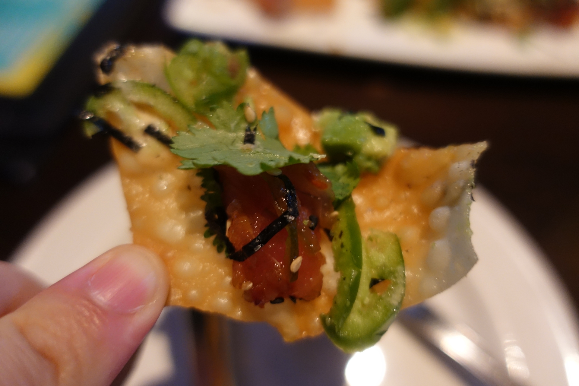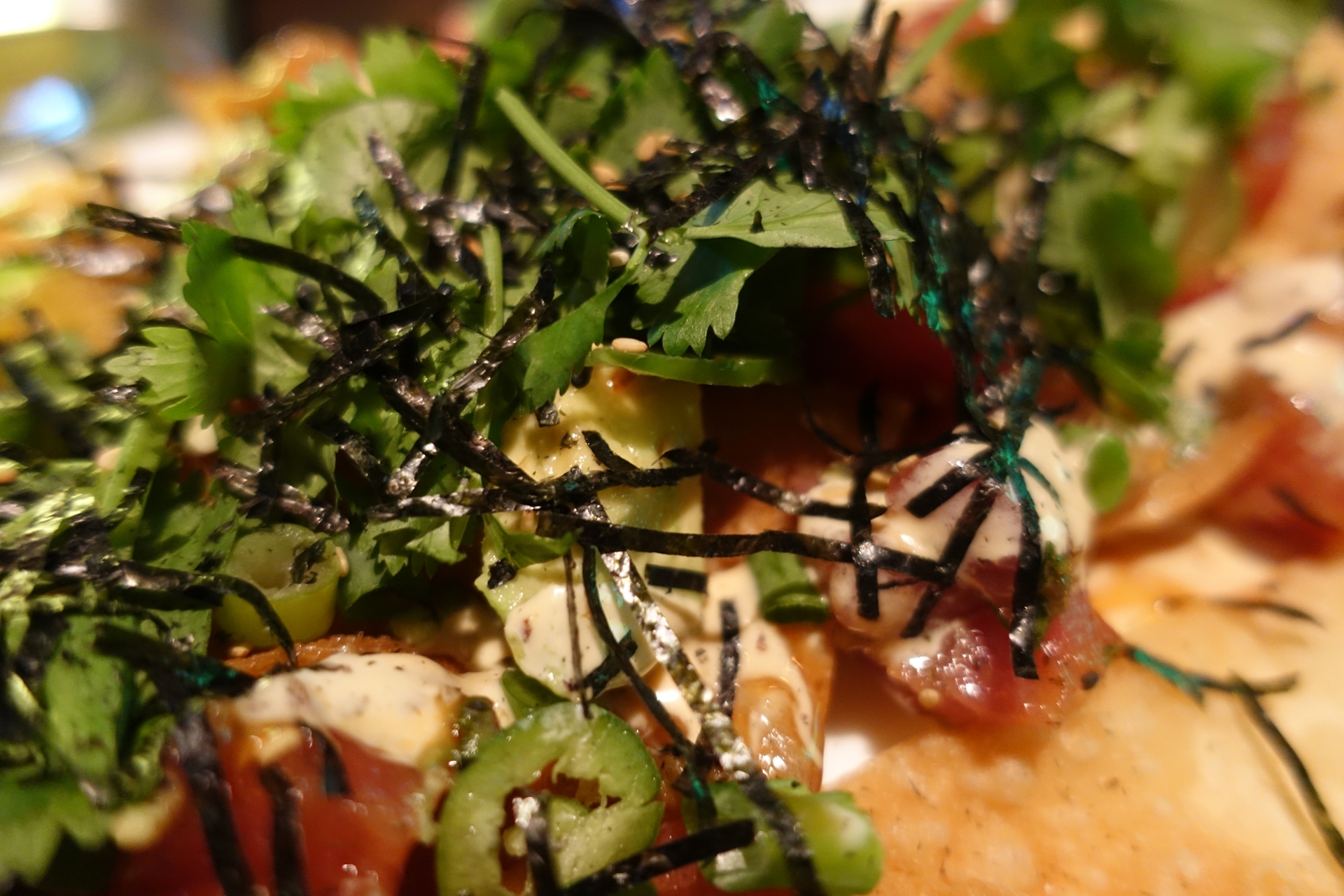 바삭한 나초 위에 포케와 아보카도, 그린 어니언(으로 포장한 파), 김가루와 고수들이 잔뜩 올라가 있는 모습