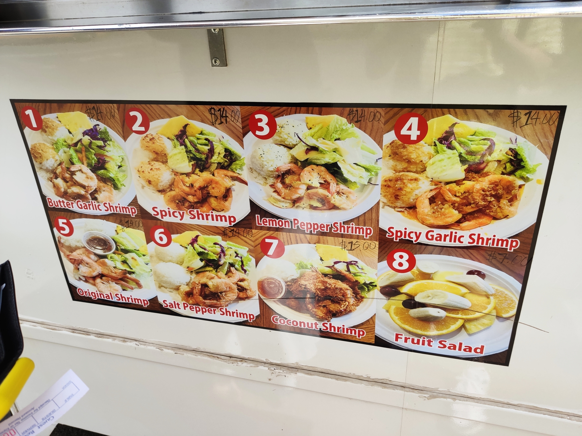 근자에 가격이 조금 오른 듯 합니다. 새우 샐러드 밥 매쉬포테이토 한 세트에 $14, 코코넛 쉬림프는 $15, 과일 샐러드는 $7인데 새우트럭 와서 과일샐러드 시키는 건 배스킨라빈스 가서 설렁탕 시키는 거랑 비슷한 듯
