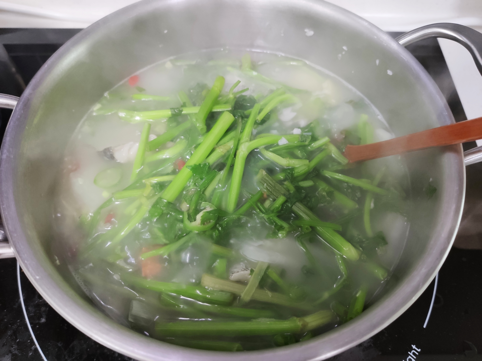 재료를 집어넣을 때 비린내가 나는 것 같아 걱정했습니다만, 다행히 마늘이랑 생강이 냄새를 잘 잡아줘서 요리가 끝났을 때에는 냄새 없는 맛있는 탕을 먹을 수 있었습니다. 고추 덕분에 칼칼하고 시원한 국물도 좋았구요. 잔뜩 들어간 미나리도 맛있었습니다.