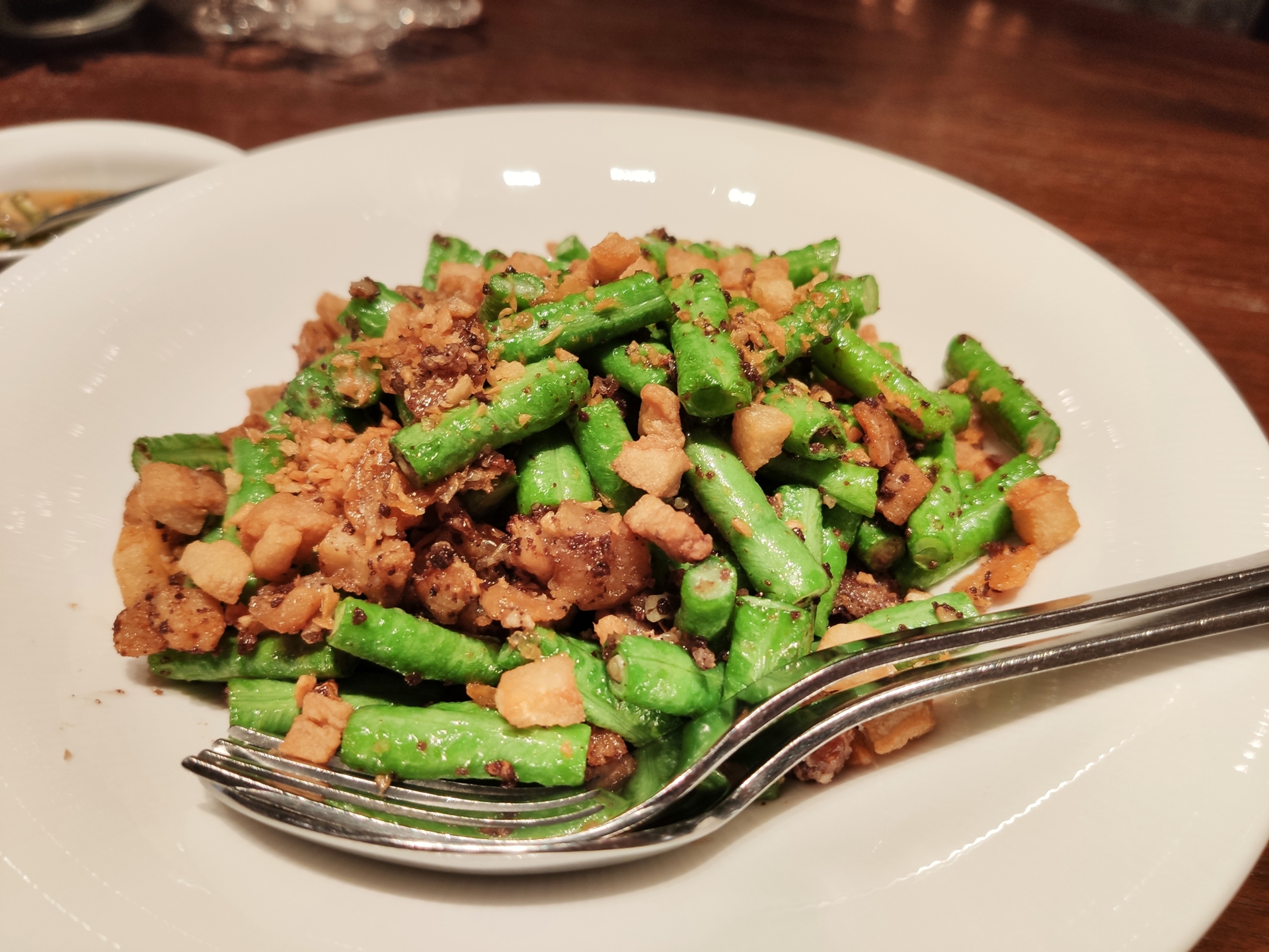 태국식 삼겹살 튀김 드셔보신 분은 알겠지만 엄청 바삭하게 구웠는데도 기름집니다. 근데 심지어 이건 껍데기라 과자처럼 씹히는데 기름짐. 곁들이는 콩도 신선하고 맛있습니다. 와이프가 원래 돼지 껍데기 같은 것 입에 안 대는데 이건 맛있다고 좀 집어먹었네요.