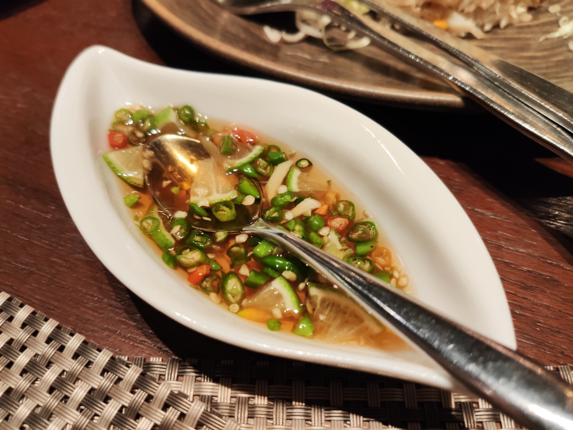 라임이랑 레몬 태국고추 등이 들어간 이 소스를 "조금만" 넣어서 먹으라고 서버가 신신당부를 하고 가셨는데요...