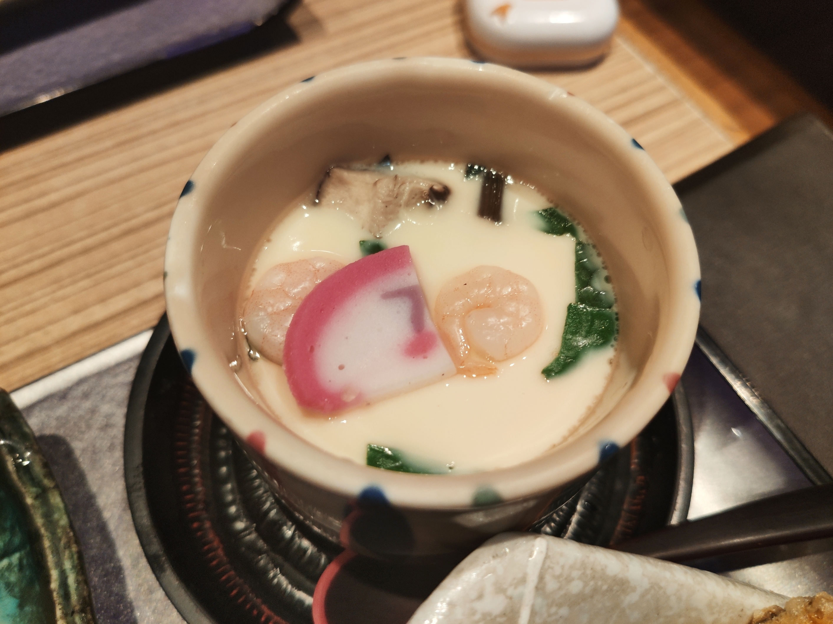 요 세트에서 가장 일본 냄새가 풍겼던 계란찜인데, 일본적인 부분은 부드럽게 가지런히 보슬보슬 담아놓은 비주얼과 식감이고 한국적인 부분은 버섯이며 새우며 이것저것 담아놓은 토핑 중 맨 위에 위치한 뻐얼건 오ㅡ뎅