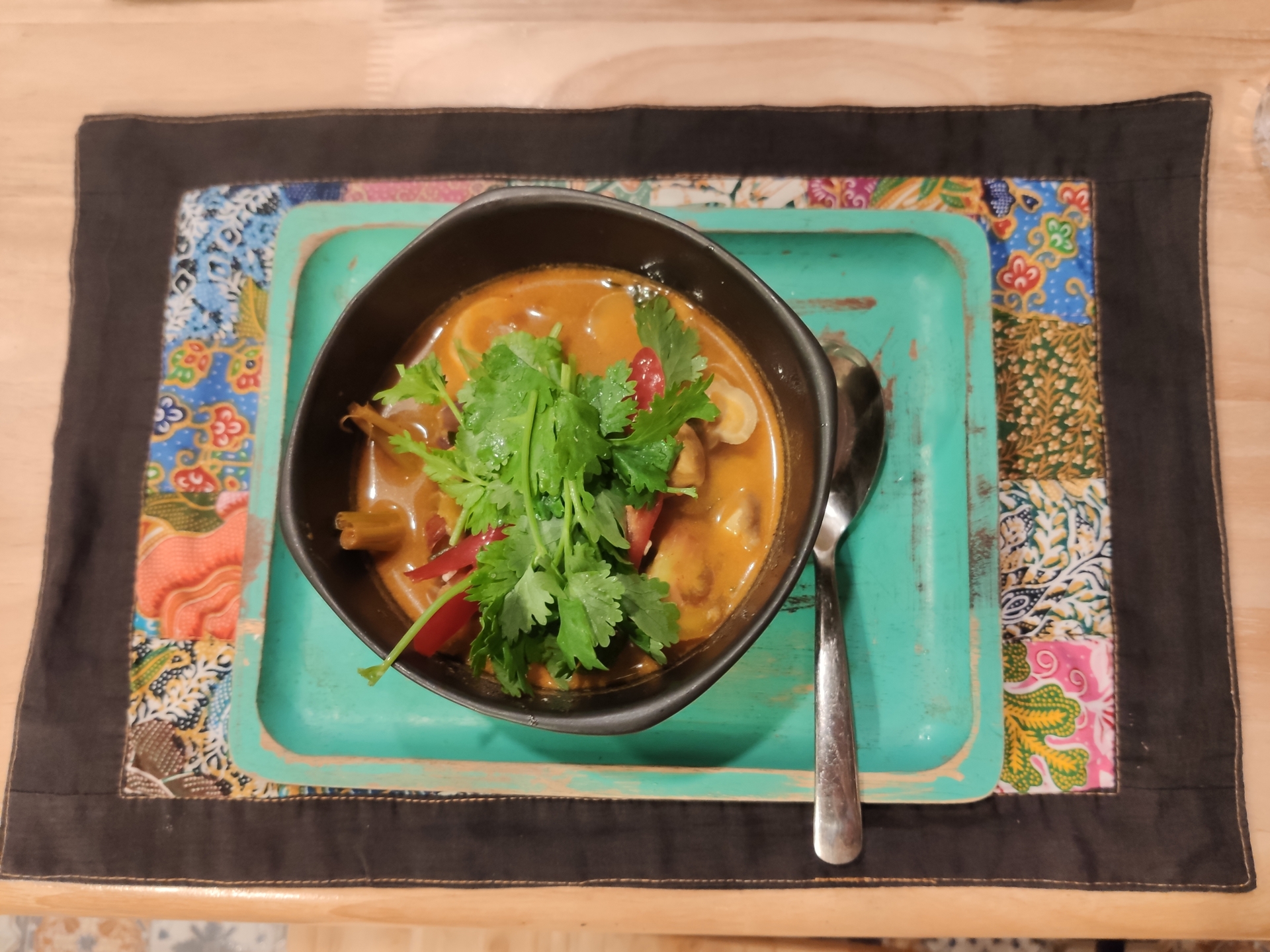 타마린드 쥬스랑 뭐 어쩌고랑 저쩌고랑 아까 만들었던 재료를 다 때려넣고 마지막에 고수까지 올렸더니 이게 바로 홈메이드 똠얌꿍 와아~