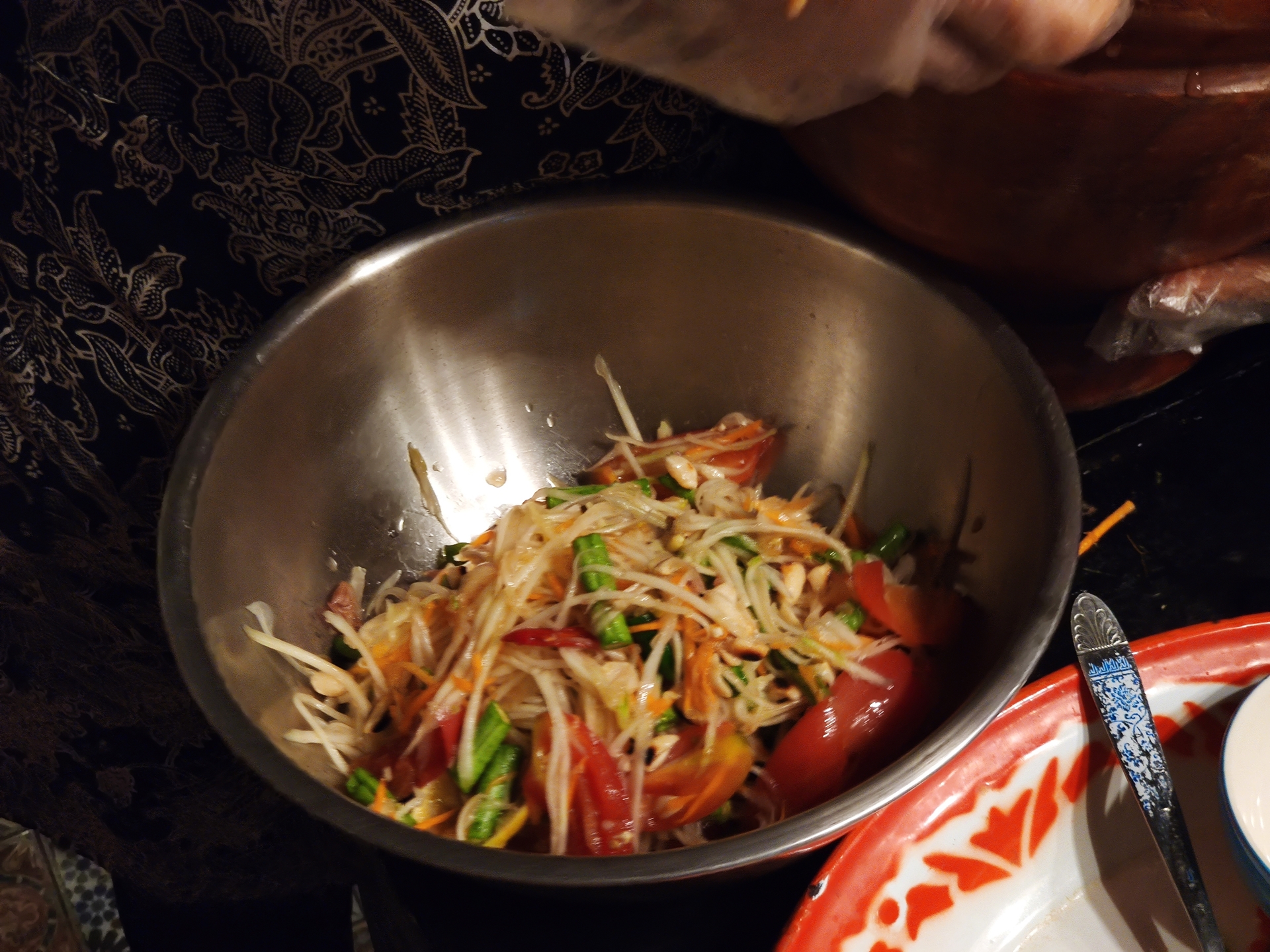 똠얌꿍이나 팟타이는 별도의 설명이 필요 없습니다만 요 쏨땀은 못 보신 분이 있으실 것 같은데요, 영어로 풀어쓰면 그린 파파야 샐러드입니다. 덜 익은 파파야를 좍좍 썰어서 새콤달콤한 소스와 함께 생채처럼 먹는 음식