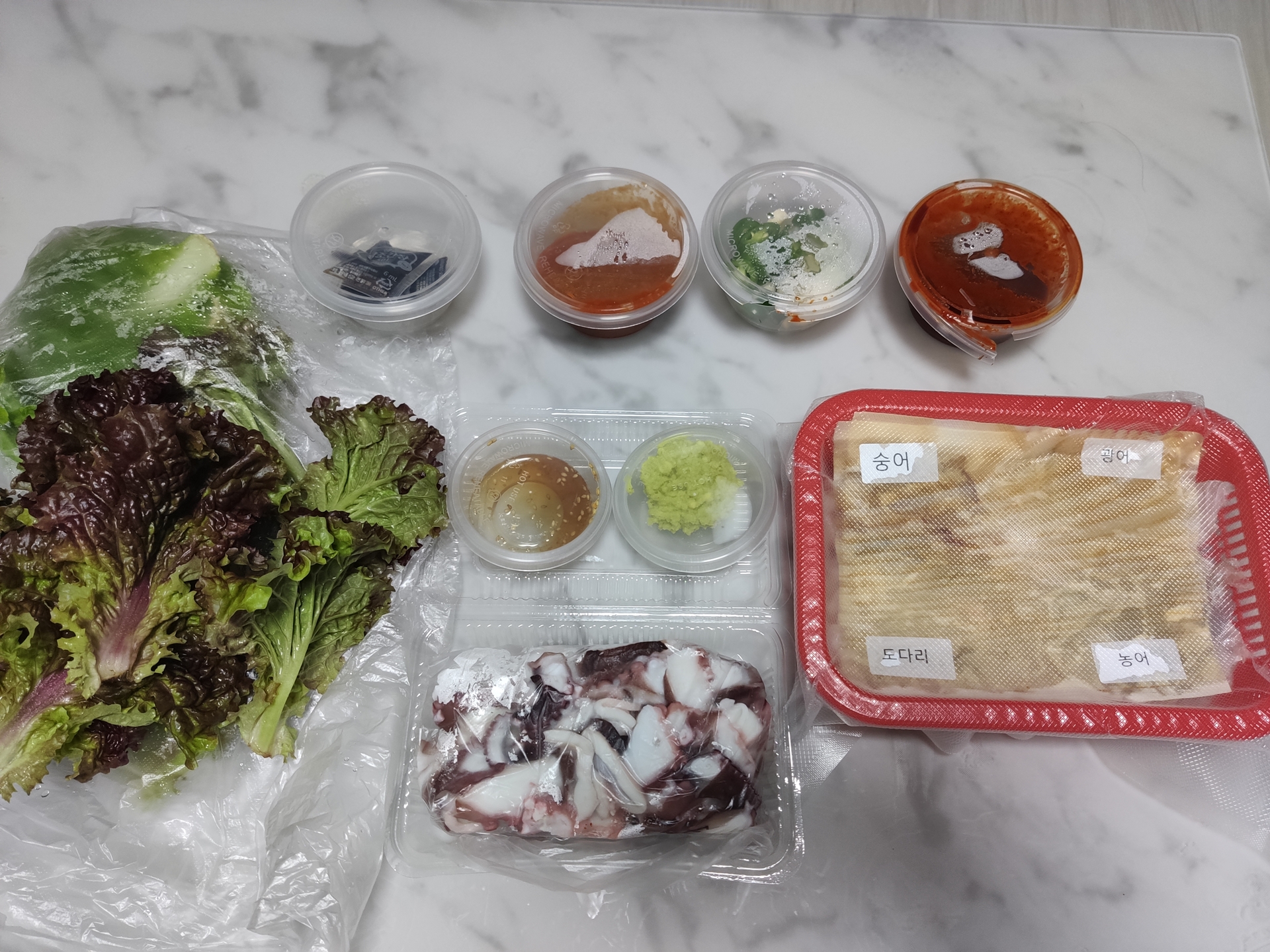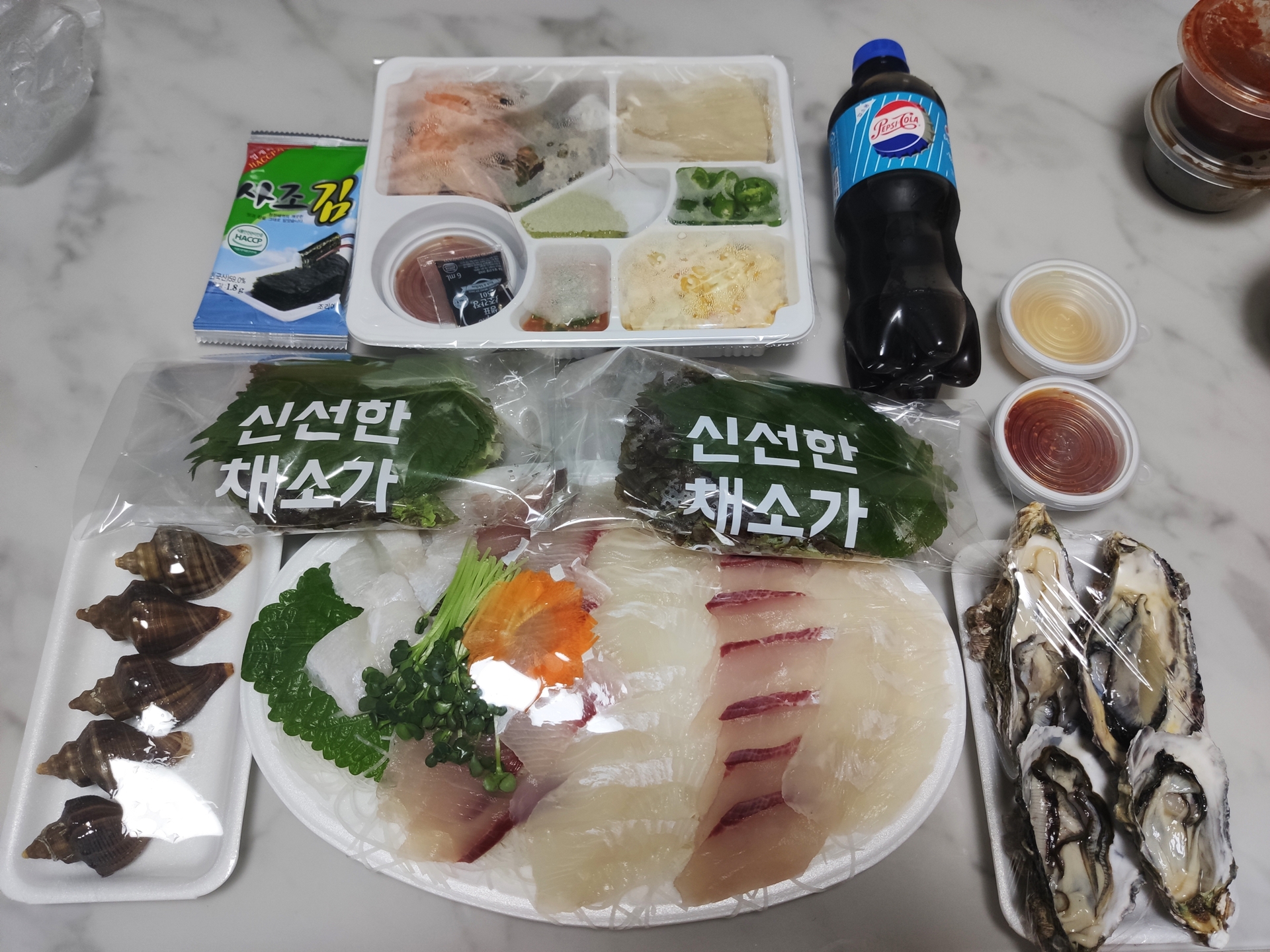 이렇게 뭘 바리바리 싸 주는 한국식 횟집에서 배달해 먹어보는 건 처음인데 아내가 매우 좋아했습니다. 회보다 사이드를 더 좋아하더라 -.-