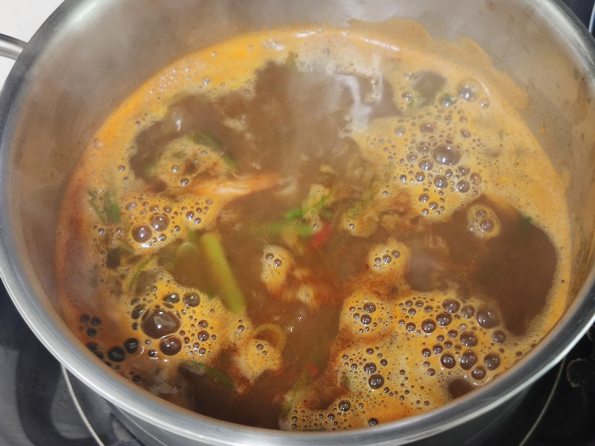 육수를 녹여서 넣고 끓이다가 메밀면을 넣어주면 육수가 살짝 걸쭉해집니다.