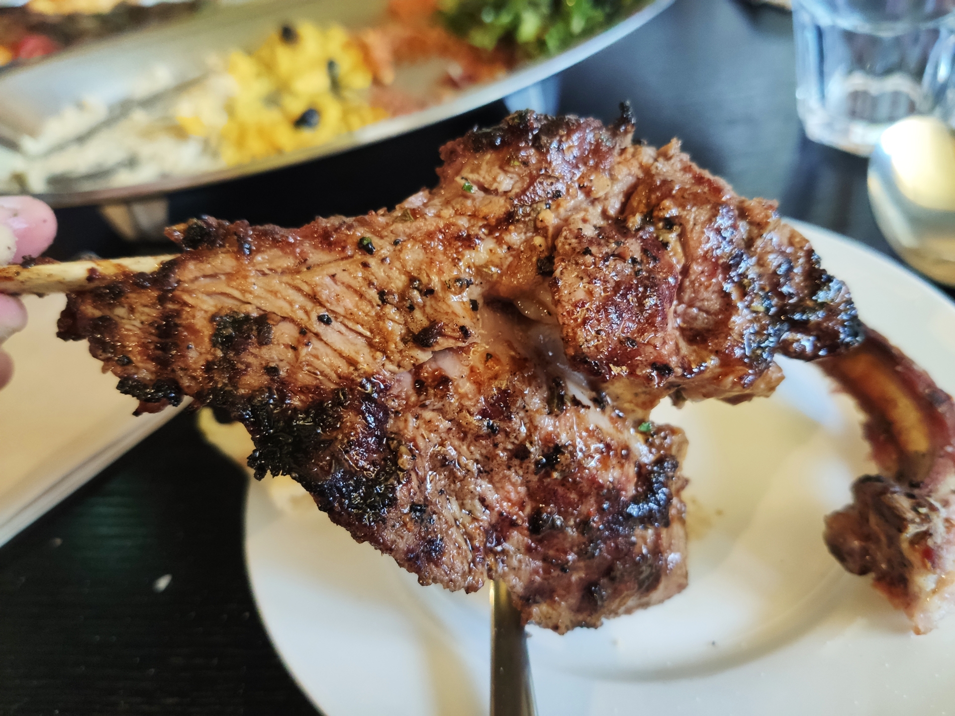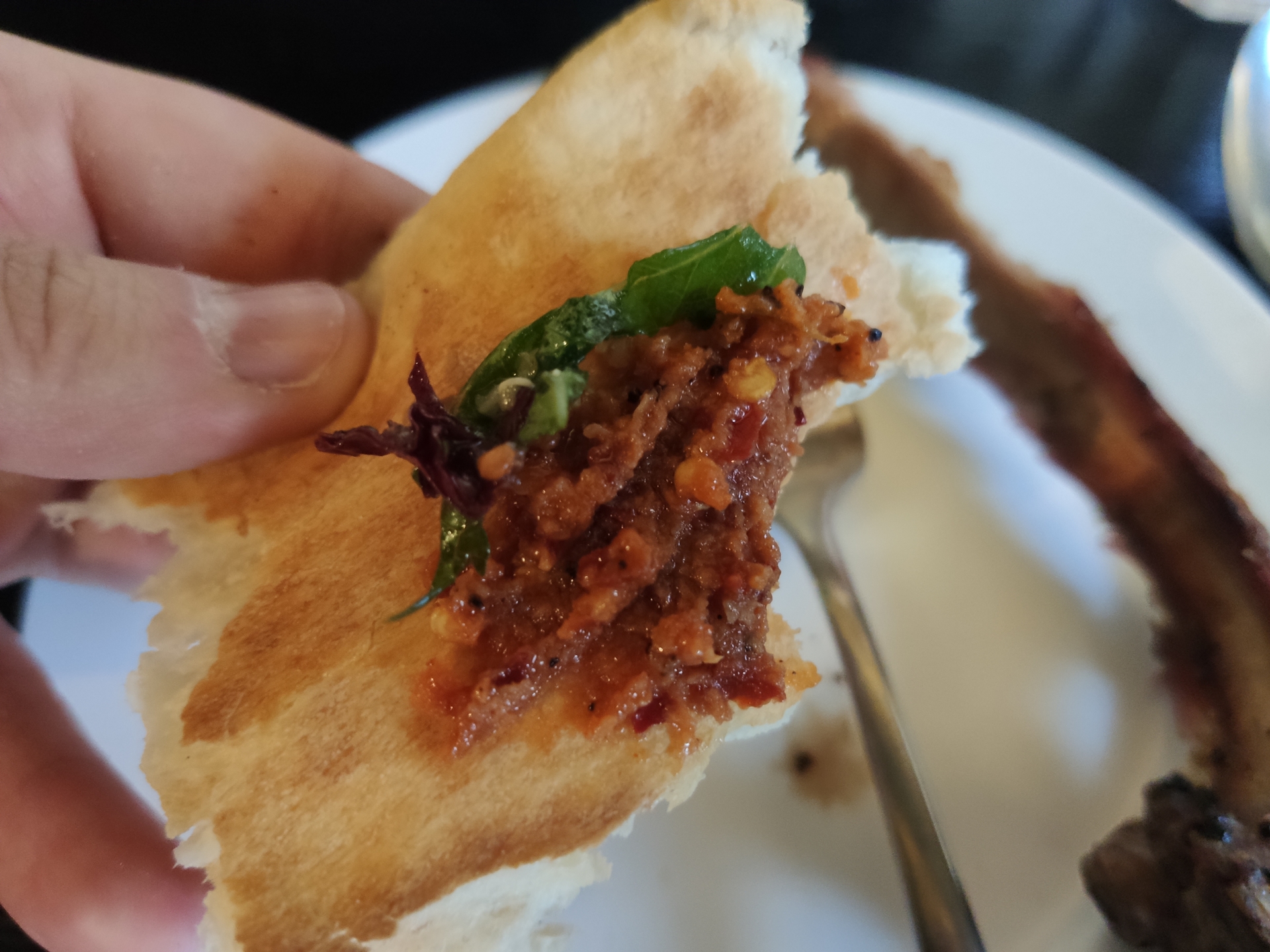 생갈비랑 양념갈비의 차이는 생갈비는 소금만 딱 찍은 고기맛 위주, 마리네이드 갈비는 거기에 중동식 양념 맛보기를 살짝 첨가한 느낌인데 막 되게 중동감수성이 있어야 먹을 수 있는 그런 맛이 아니라 오히려 양고기 초보자에게도 권할 수 있는 맛이네요. 중동감성이 분명 있는 맛인데도 불구하고 이건 다른 사람들한테도 추천할 수 있겠다 싶었습니다.