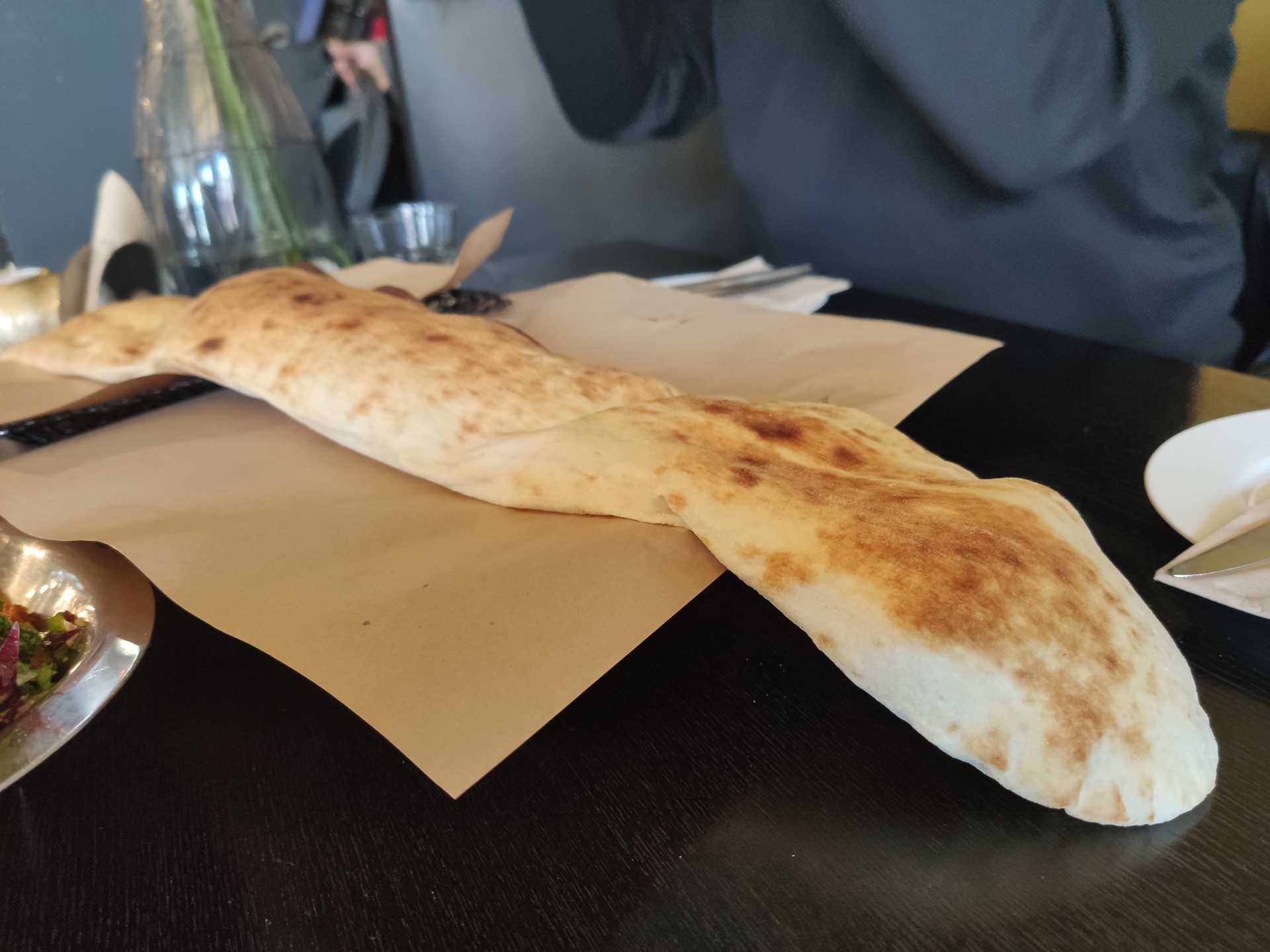 피타브레드가 소금이랑 올리브유 넣고 반죽해서 구운 식사빵인데 가운데가 뻥 뚫려있는 빵이에요. 맛이 어떤 느낌이냐면 딱 간 살짝 돼 있는 밀가루빵? 저는 이런거 좋아하는데 사실 안 좋게 말하면 맹맛이고요. 그런데 어차피 빵 안팎으로 후무스 넣고 찍어먹을 거라고 생각해보면 이런 식으로 맛에 특징없고 간만 살짝 돼 있는 도화지같은 느낌이 후무스랑 참 잘 어울리는 것 같습니다.
