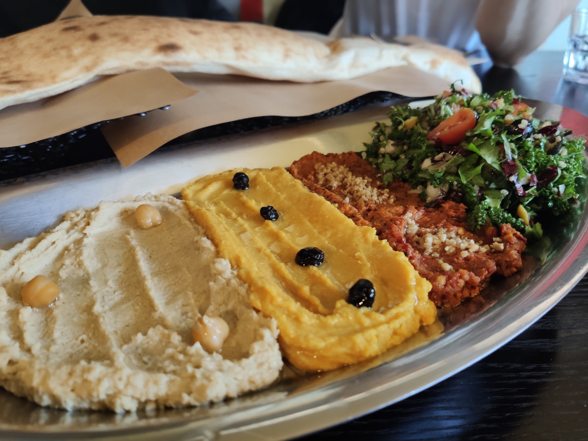 오른쪽에 빨간 게 "가지소스" 랑 "고추석류소스" 라고 나온 건데 (잘 구분은 안 되네요 위아래가 조금 다름) 후무스 재료인 병아리콩 대신 가지를 넣고 만드는 "바바가누쉬" 라는 스프레드인 것 같습니다. 거기에 파프리카를 넣고 갈아서 붉은 색을 냈다고 하네요.