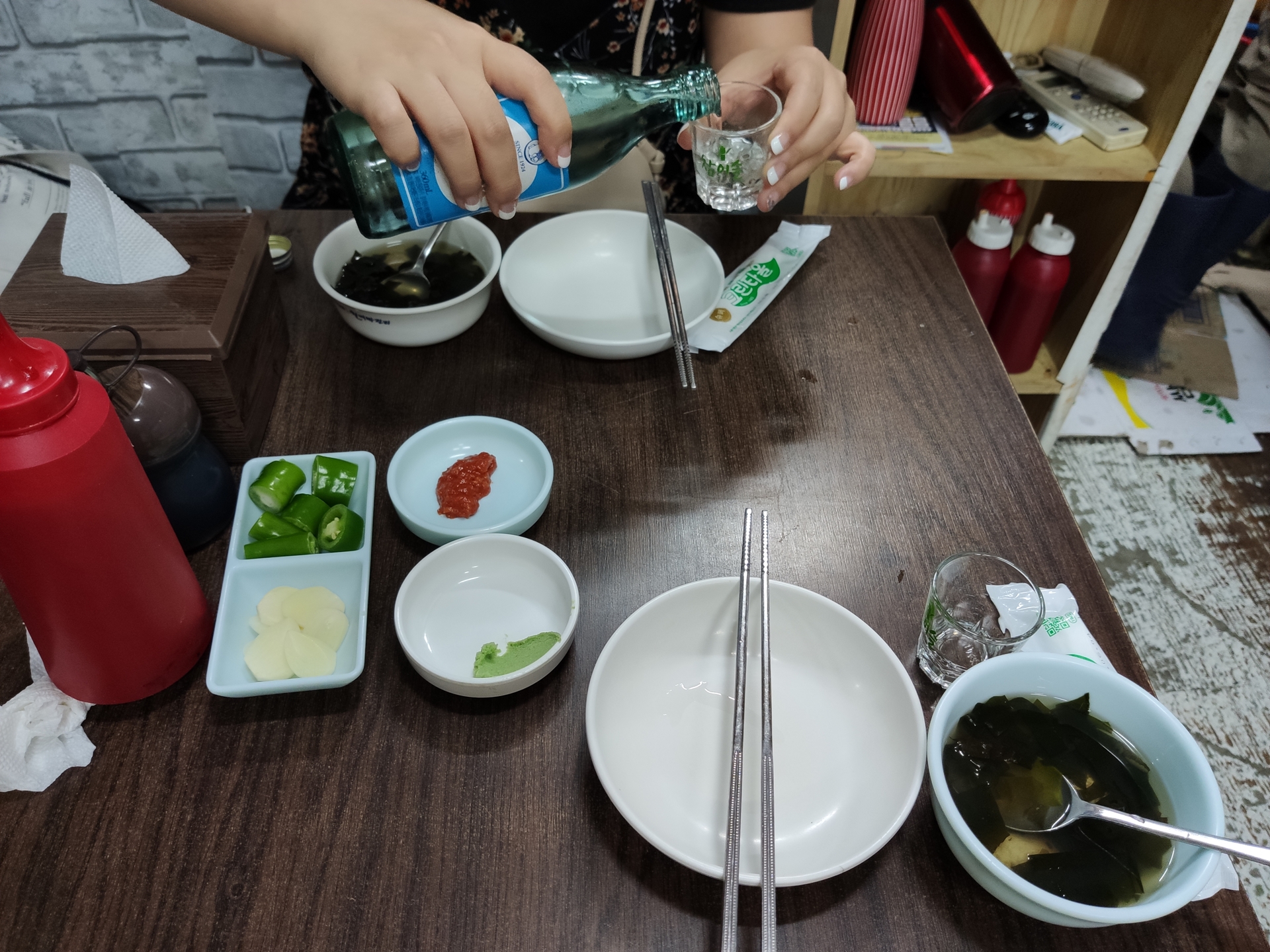 시간은 5시 55분 음식은 주문한지 얼마 되지 않아 아직 나오지 않았지만 눈앞에 술이 있는데 뭐다? 마셔야한다.